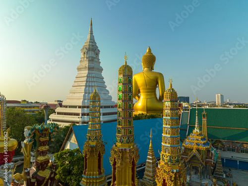 Naklejka premium .aerial view golden big Buddha Wat Paknam Phasi Charoen in sunset. .beautiful...