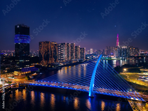 Fototapeta premium Aerial view Ho chi minh city and Saigon river in Vietnam, neon illuminated of bridge and business center with skyscrapers with night stars