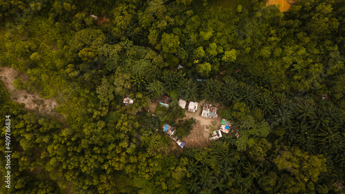 © Jemang, Obraz premium aerial view house in the middle of forest.