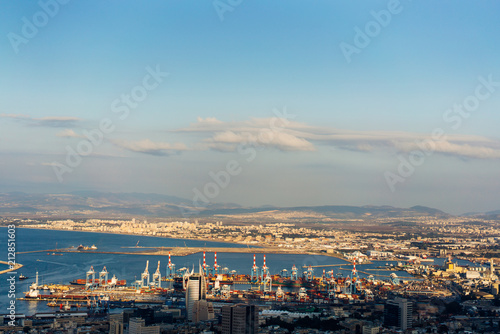 © teksomolika, Naklejka premium Aerial view industrial cargo port with ships and cranes