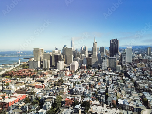 Fototapeta premium Aerial view Jackson Square neighborhood with downtown skylines and Bay Bridge in background