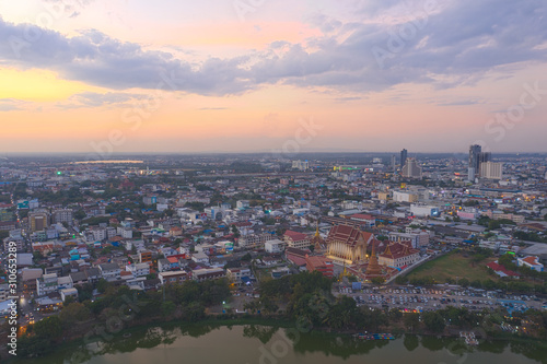 Fototapeta premium Aerial view Khon Kaen province with Wat That at bueng kaen nakhon lake in...