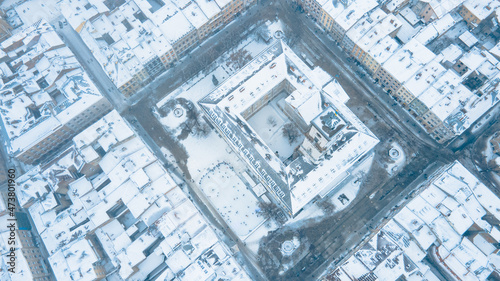 © phpetrunina14, Fototapeta premium aerial view lviv city at winter misty day