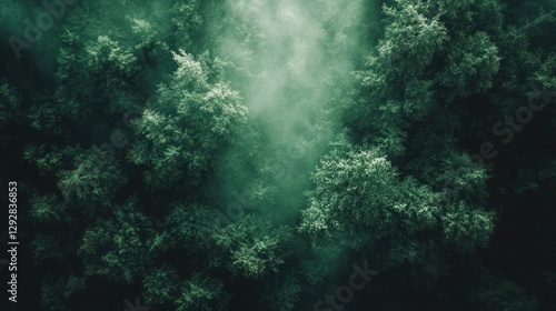 Fototapeta premium Aerial view misty forest, sunlight, nature, background, design