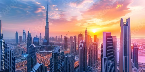 © Marc Kunze, Fototapeta premium Aerial view modern city skyline at sunset