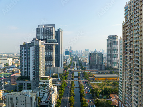 © themorningglory, Obraz premium Aerial view modern office building with transport road sunset sky Silom financial district