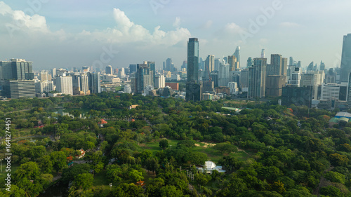 Naklejka premium Aerial view modern office city building green tree park Lumpini public park downtown