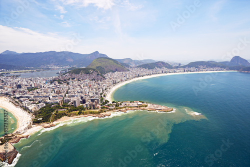 © Marius Venter/peopleimages.com, Naklejka premium Aerial view, ocean and buildings in city, outdoor and architecture in Brazil, tourism and destination. Morning, above and travel in Rio De Janeiro, water and explore in vacation and mountain in sea