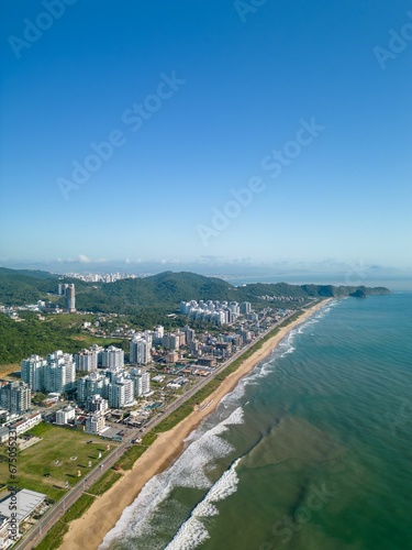 © Wirestock, Fototapeta premium Aerial view of a beach and Praia Brava cityscape in the background under the blue sky