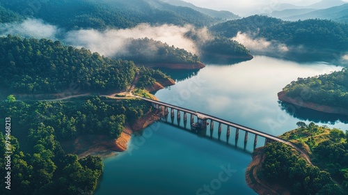 Fototapeta premium Aerial view of a beautiful dam spanning a tranquil lake, surrounded by vibrant forests and misty mountains, creating a peaceful landscape