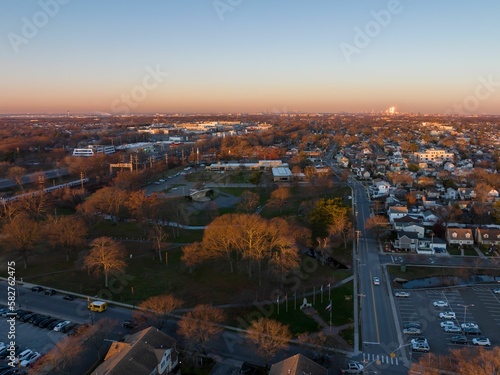 Naklejka premium Aerial view of a beautiful sunset sky over a suburban neighborhood
