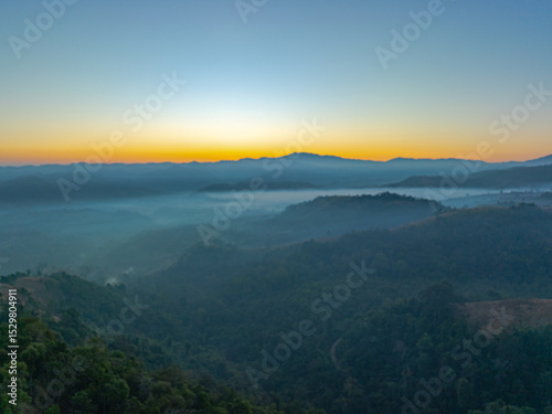 © Narong Niemhom, Obraz premium Aerial view of A breathtaking aerial view of a lush, green mountain range under a bright, clear blue sky, with sunlight illuminating the vast, rolling terrain and valleys below.