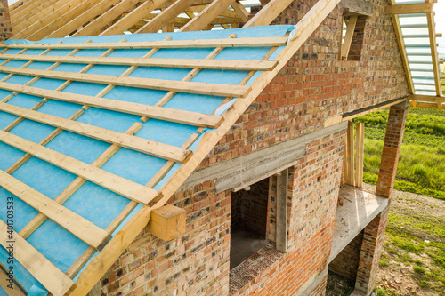 © bilanol, Fototapeta premium Aerial view of a brick house with wooden roof frame under construction.