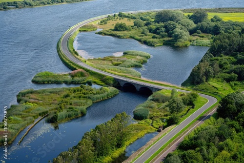 Fototapeta premium Aerial view of a bridge spanning across a serene river with lush green...