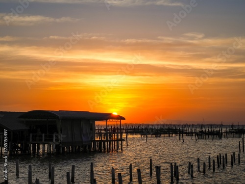 Fototapeta premium Aerial view of a bright sunset sky over wooden poles in the clear Songkhla...