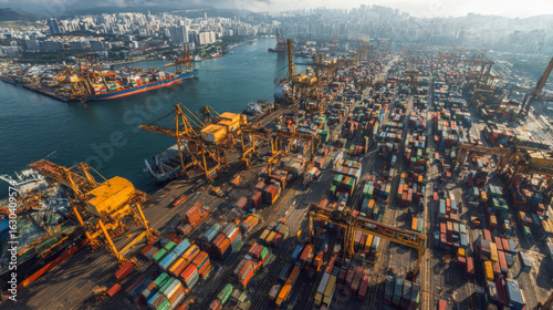 © Natalia, Obraz premium Aerial view of a busy shipping port with numerous colorful containers stacked neatly, cranes operating, and ships docked, showcasing the logistics and maritime industry