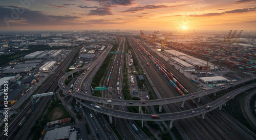 © Ascents, Naklejka premium Aerial view of a busy transportation logistics hub at sunset