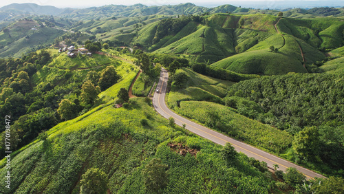 © Farknot Architect, Naklejka premium Aerial view of a car running along the mountain road on the hill by drone