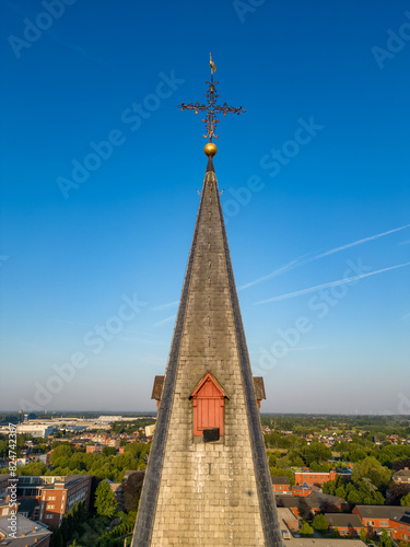 © Bjorn B, Fototapeta premium Aerial view of a church steeple with a cross in a suburban area, displaying architectural beauty under a clear blue sky