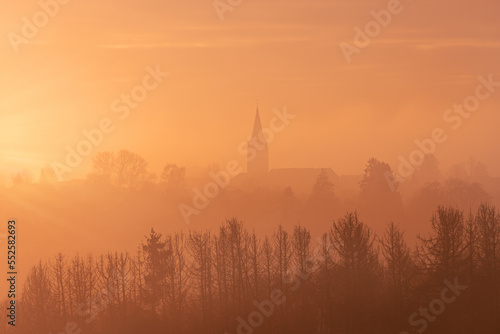 © Julia, Fototapeta premium Aerial view of a church with trees in the foreground in the warm tones of sunset in Germany, dramatic sky