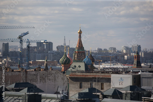 Fototapeta premium Aerial view of a city featuring a red and green dome foreground