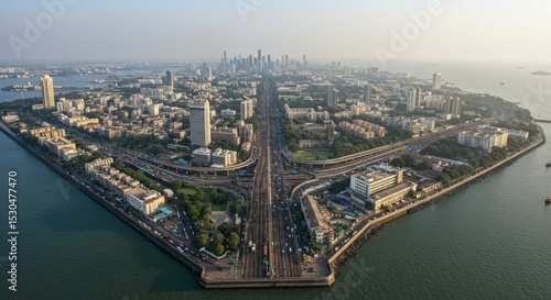 Obraz premium Aerial view of a city island with highways and buildings