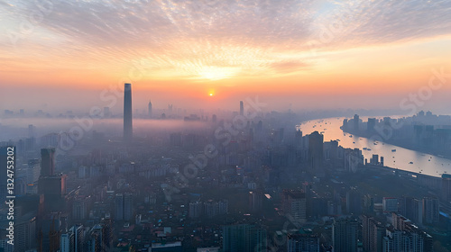 © julio, Fototapeta premium Aerial View Of A City Skyline At Sunrise With Golden Light Over Buildings And River Through Dense Fog