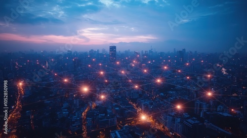 Fototapeta premium Aerial view of a cityscape with connected nodes at dusk.