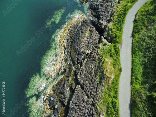 Fototapeta premium Aerial view of a coastal path with rocky cliffs and lush greenery by the calm sea in Bangor, Ireland
