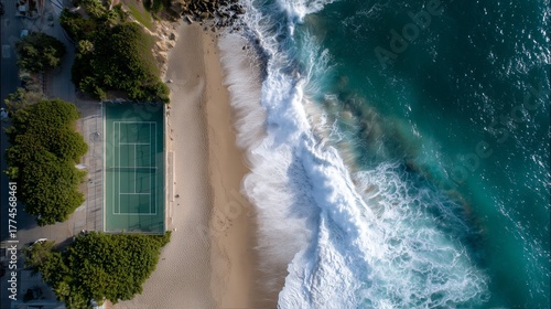 © fotofabrika, Fototapeta premium Aerial view of a coastal tennis court near crashing waves at sunset