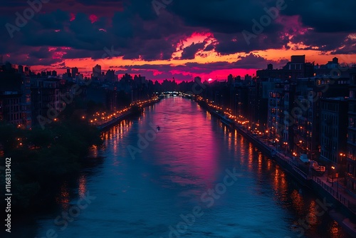 © Akash, Fototapeta premium Aerial view of a colorful cityscape with river reflections at sunset