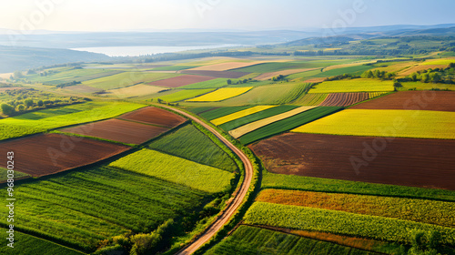 © Pter, Fototapeta premium Aerial View of a Colorful Patchwork of Agricultural Fields in Early Spring with a Dirt Road Winding Through