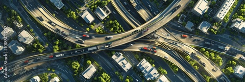 Naklejka premium Aerial view of a complex highway interchange surrounded by greenery and urban...