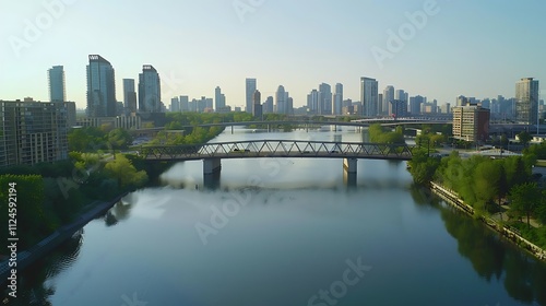 © UmerDraz, Naklejka premium Aerial view of a contemporary bridge with calm water beneath and surrounding cityscape.