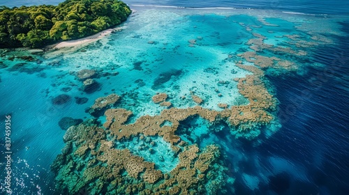Fototapeta premium Aerial view of a coral atoll surrounded by clear water