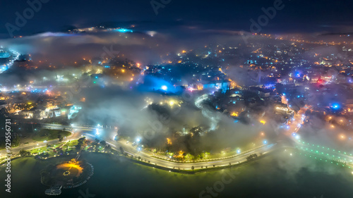 © huythoai, Fototapeta premium Aerial view of a Da Lat City in the mist magical night, hiden in the fog and clouds. Urban development texture, transport infrastructure. Tourist city in developed Vietnam. Night cityscape