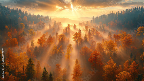© Your Hand Please, Fototapeta premium Aerial view of a dense autumn forest blanketed by fog, creating a serene and mystical atmosphere. The vibrant foliage of red, orange, and gold symbolizes transformation, renewal, and the beauty of cha