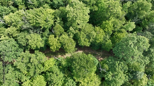 © Wirestock, Naklejka premium Aerial view of a dense forest with a dirt path.