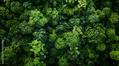 Naklejka premium Aerial view of a dense forest with lush green trees, from a top down perspective. An aerial view of a dense jungle foliage with many different tree species, from a topdown view.