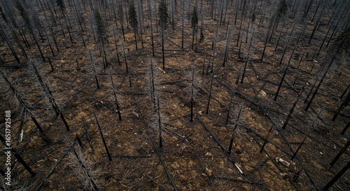 Fototapeta premium Aerial View of a Devastated Forest After a Wildfire, Charred Trunks and Branches