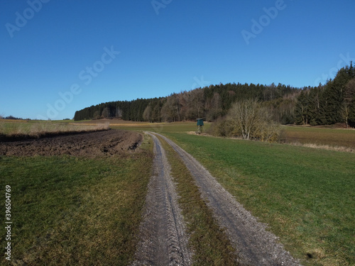 © were, Fototapeta premium Aerial view of a dirt road between fields