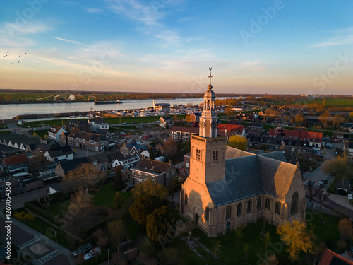 © badescu, Fototapeta premium Aerial view of a Dutch Catholic church on the banks of the De Lek river in the southern Netherlands. Spring landscape with houses clustered on the vast plain of the Netherlands in the evening at sunse