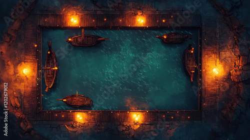 © Haki, Naklejka premium Aerial view of a fantasy battle map game, showing ships at night