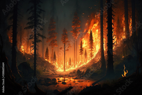 © erika8213, Obraz premium Aerial view of a forest fire - Generative AI