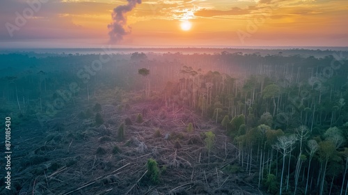 Naklejka premium Aerial view of a forest with smoke and a setting sun in the distance. The forest is partially cleared, with some trees remaining.