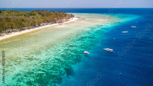 Obraz premium Aerial view of a fringing coral reef and warm, tropical ocean