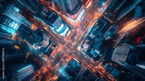 © Alpha, Fototapeta premium Aerial view of a futuristic city with neon lights at night