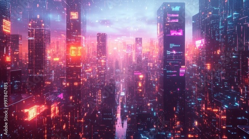 Naklejka premium Aerial view of a futuristic city with neon pink and blue lights illuminating tall skyscrapers. Concept: Cyberpunk cityscape and future technology.