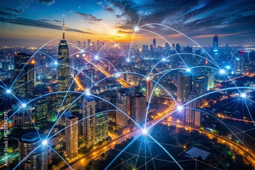 Fototapeta premium Aerial View of a Global Financial Network with Digital Connections Illustrating the Impact of Fintech and Blockchain Technology in Low Light Photography