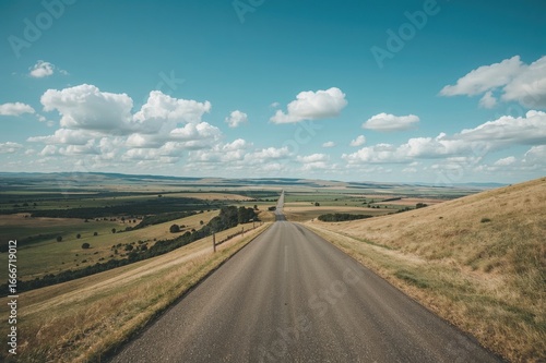 © vxnaghiyev, Naklejka premium Aerial view of a highway cutting across flat grasslands in a wide-angle panorama